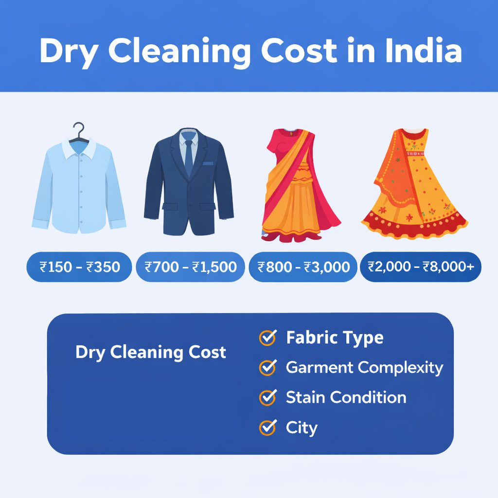 Dry cleaning charges vary across Indian cities due to rent, labour, and logistics costs.